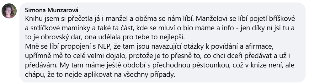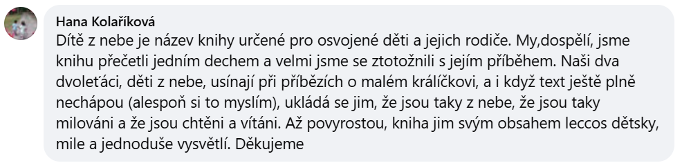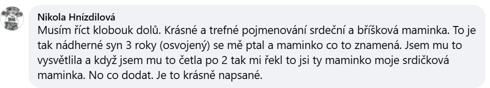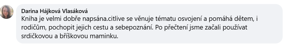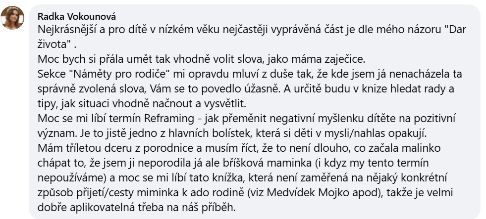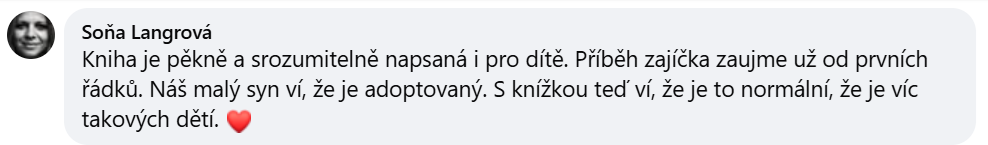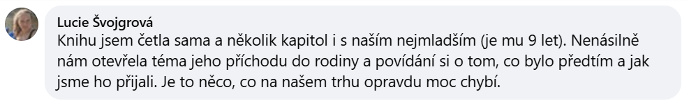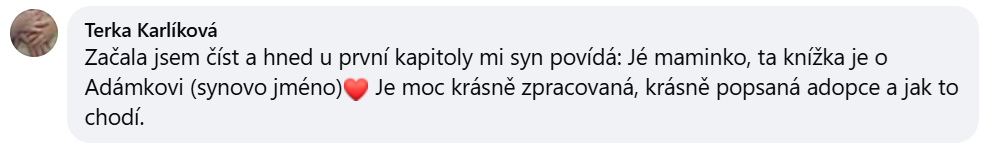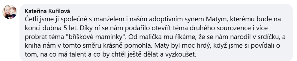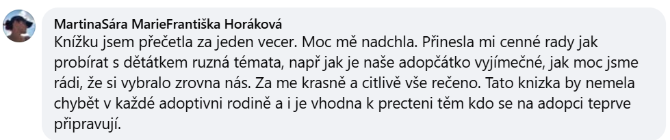 Máme 8 měsíců doma prcka a začátky nebyly lehké a hodně mě semlely, ale díky Vaší knize jsem si ještě víc ujasnila jak chci synovi předat informace o adopci. Na některé věci jsem, před přečtením knihy, měla jiný názor a tak, jako se o nich píše ve Vaší knize, bych o nich nemluvila, ale po přečtení mi došlo, že můj postup by malému mohl ublížit a tak rozhodně pojedu podle Vaší knihy.