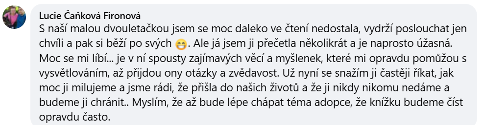 Knih tohoto typu je u nás stále jako šafránu, o to víc vítám každou další. Celkově se nám kniha velmi dobře četla, s tématem pracuje velmi citlivě. Je skvělé, že se nezapomnělo ani na původní matku. Vše hezky rozdělené do několika celků, kapitol. Jako "srdíčkový" rodič jsem ocenila prvky koučinku zahrnuté do příběhu, poučky na závěr, jak s knihou pracovat a jaké otázky s dítětem probrat.