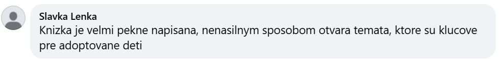 Je to knížka, která by měla mít svoje pevné místo v knihovničce osvojeného dítěte a ke které se budou děti vracet. Rodičům nabízí velmi cennou pomůcku při otevírání nelehkých témat a rozhovorů, které se tímto stávají vzájemnou terapií.