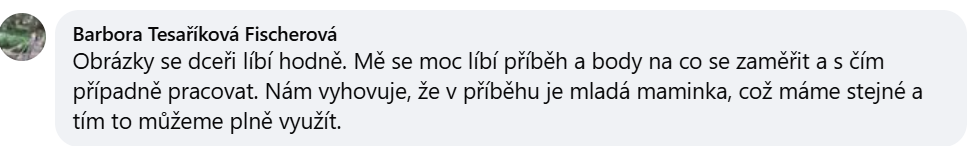 Knížka je moc krásná a smyslupná, líbí se mi, že to není jen příběh, ale obsahuje i náměty na další rozhovory s děťátkem.